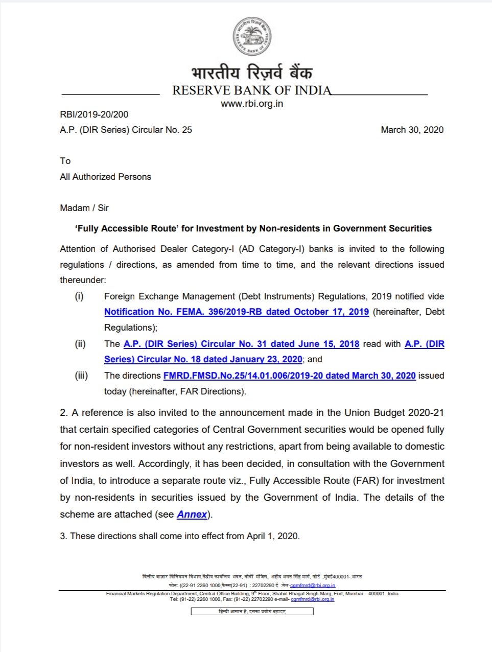 Ministry Of Finance On Twitter Rbi Has Today Issued A Circular To Implement The Union Budget 2020 21 Proposal To Fully Open Up Specified Government Securities For Non Resident Investors Https T Co 5igi2o2fra